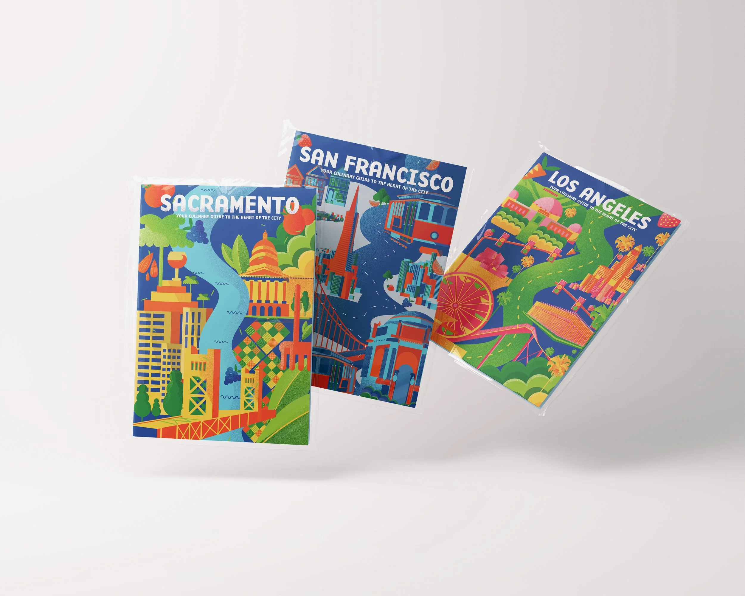 This is the part where excitement is built for their next trip. They will receive a booklet to the city they are visiting to which they can flip through the pages and fill out their experience once they are the locations. The covers were inspired by travel guides and illustrations to show the cities in a fun light, feature their landmarks, and as well as some local crops that each city grows.